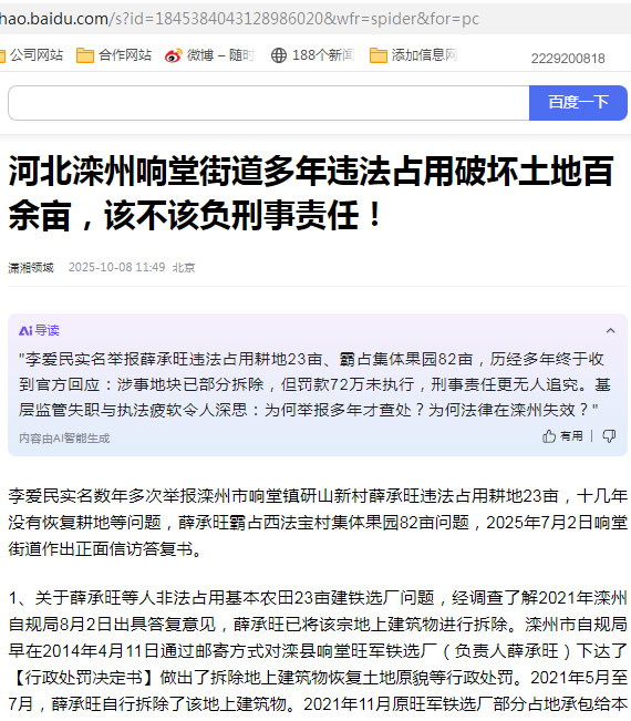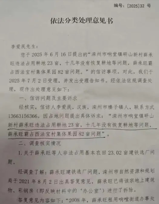 李爱民实名数年多次举报滦州市响堂镇研山新村薛某旺违法占用耕地23亩,十几年没有恢复耕地等问题,薛某旺霸占西法宝村集体果园82亩问题,2025年7月2日响堂街道作出正面信访答复书。