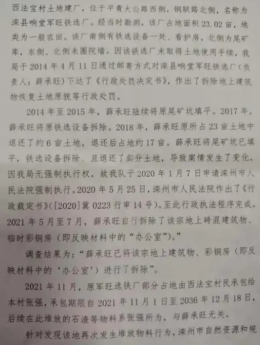 1、关于薛某旺等人非法占用基本农田23亩建铁选厂问题,经调查了解2021年滦州自规局8月2日出具答复意见,薛某旺已将该宗地上建筑物进行拆除。滦州市自规局早在2014年4月11日通过邮寄方式对滦县响堂旺军铁选厂(负责人薛某旺)下达了【行政处罚决定书】做出了拆除地上建筑物恢复土地原貌等行政处罚。2021年5月至7月,薛某旺自行拆除了该地上建筑物。2021年11月原旺军铁选厂部分占地承包给本村张强,后续在此堆放石渣等物系张强所为,与薛某旺无关。