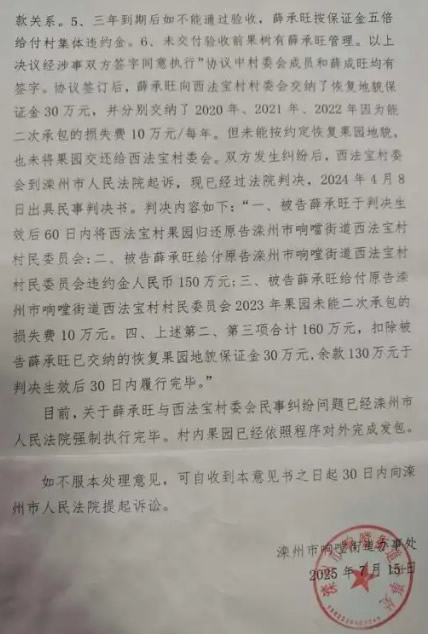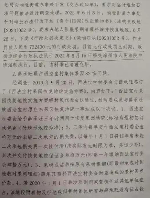 2、薛某旺霸占西法宝村集体果园82亩问题,经调查2019年9月20日,西法宝村委会与薛某旺签订了(西法宝村果园恢复地貌实施方案)但薛某旺未按约定恢复果园地貌,也未将果园交还给西法宝村委会,双方发生争论后,2024年4月8日村委会到滦州法院起诉,现已细情略过基本解决完毕。