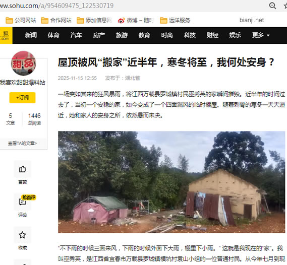 一场突如其来的狂风暴雨,将江西万载县罗城镇村民巫秀英的家瞬间摧毁。近半年的时间过去了,当初一个安稳的家,如今变成了一个四面漏风的临时棚屋。随着刺骨的寒冬一天天逼近,她和家人的安身之所,依然悬而未决。